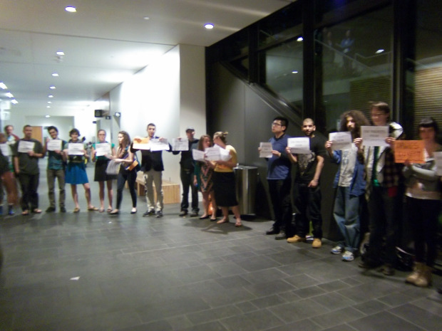 The story doesn’t end there, however. After the resolution had been defeated and the students were leaving the hall, pro-divestment students formed an intimidating semi circle as they held signs and glared, forcing everyone to walk past them on the way out. Divestment supporters also engaged in their typical harassment on social media.