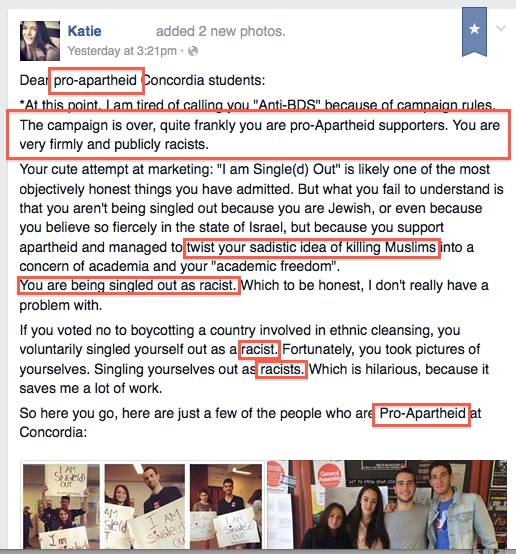 Concordia University in Canada has become infamous for extreme and violent anti-Israel activity. In 2002 anti-Israel students rioted in an incident that was collected in the documentary Confrontation at Concordia. More recently, in the usual controversy surrounding a divestment resolution anti-divestment students have been insulted, bullied, harassed, and defamed on social media, including pictures of the students designed to shame them into silence. Soon anti-Zionism spread into anti-Semitism, as graffiti appeared in bathroom stalls with such statements as “Jews are f***ed up people” and “Jews are not people.” Jewish students on campus who were not affiliated with the anti-divestment campaign were humiliated and harassed as well.